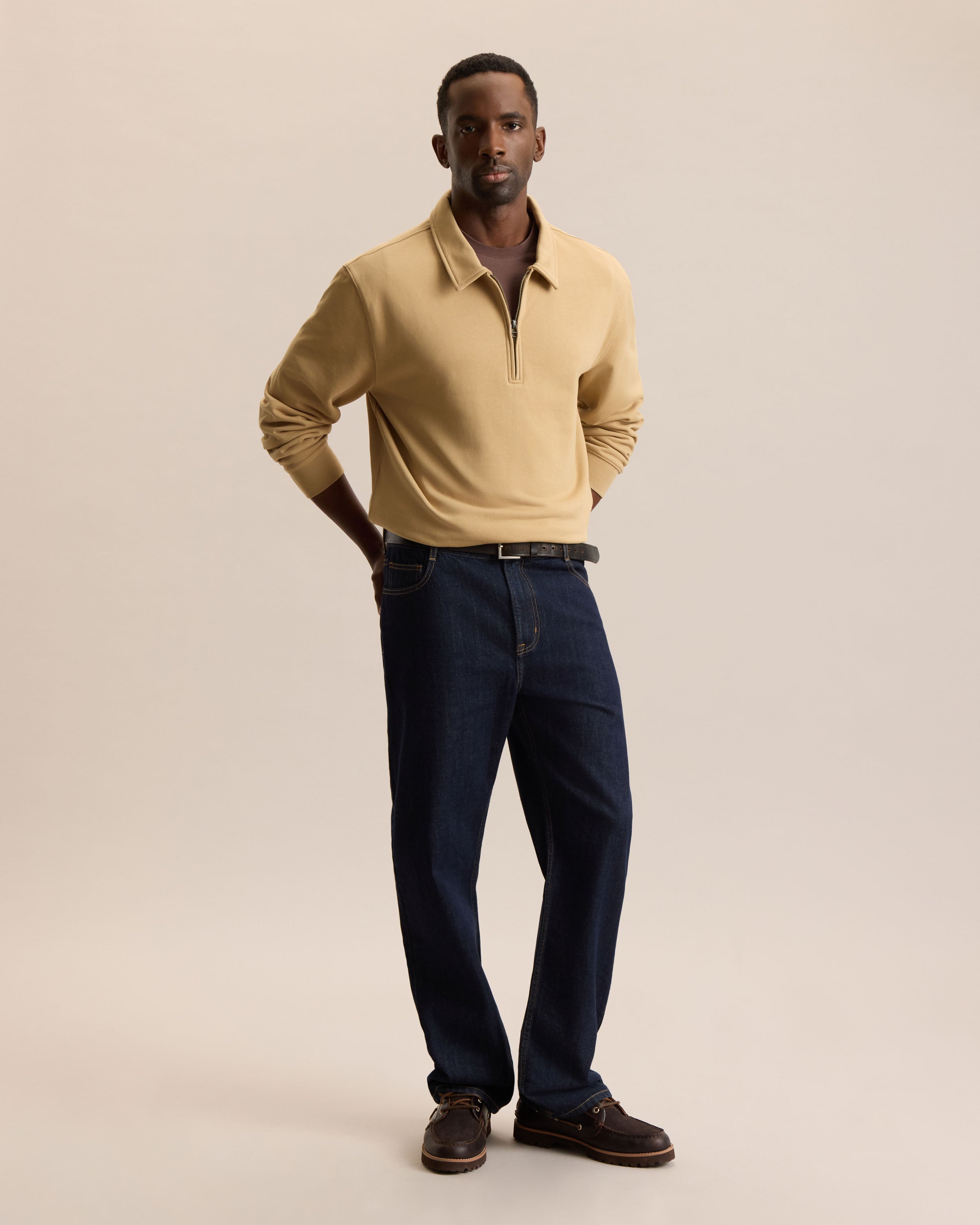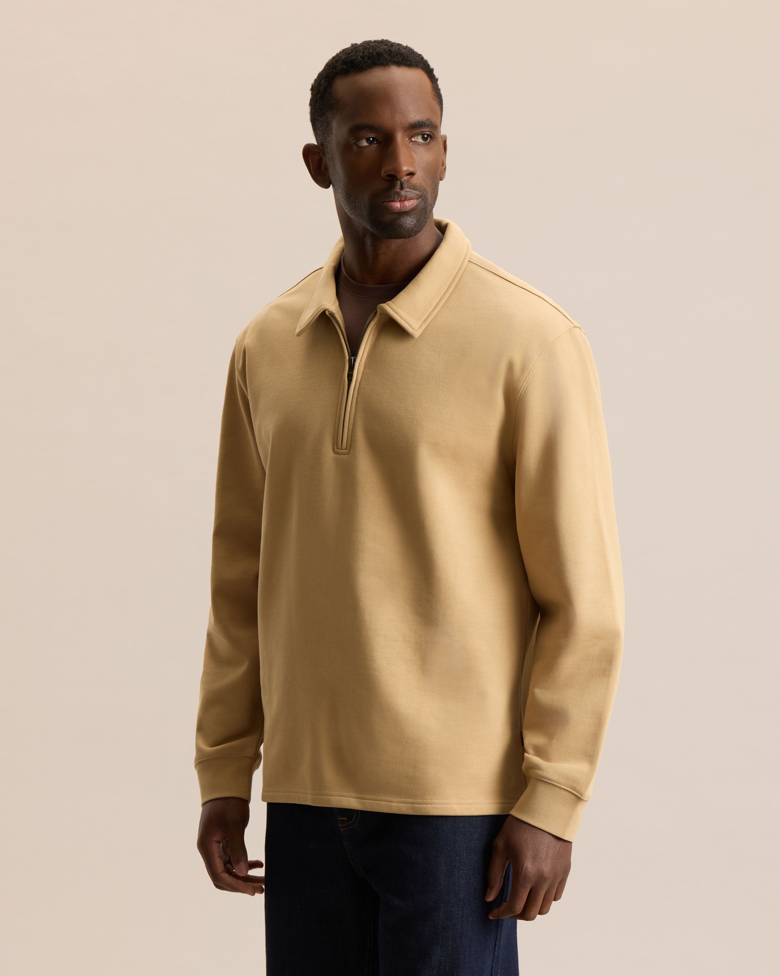 Originally designed as a functional sportswear, the quarter zip has long been valued for its practicality and ease of wear. This modern take keeps things simple and versatile. Cut in a regular fit, it offers comfort while maintaining a clean silhouette. The zip closure allows for easy temperature control, making it an ideal layer for everyday wear. Made from 380gsm French terry, it delivers warmth and durability.
