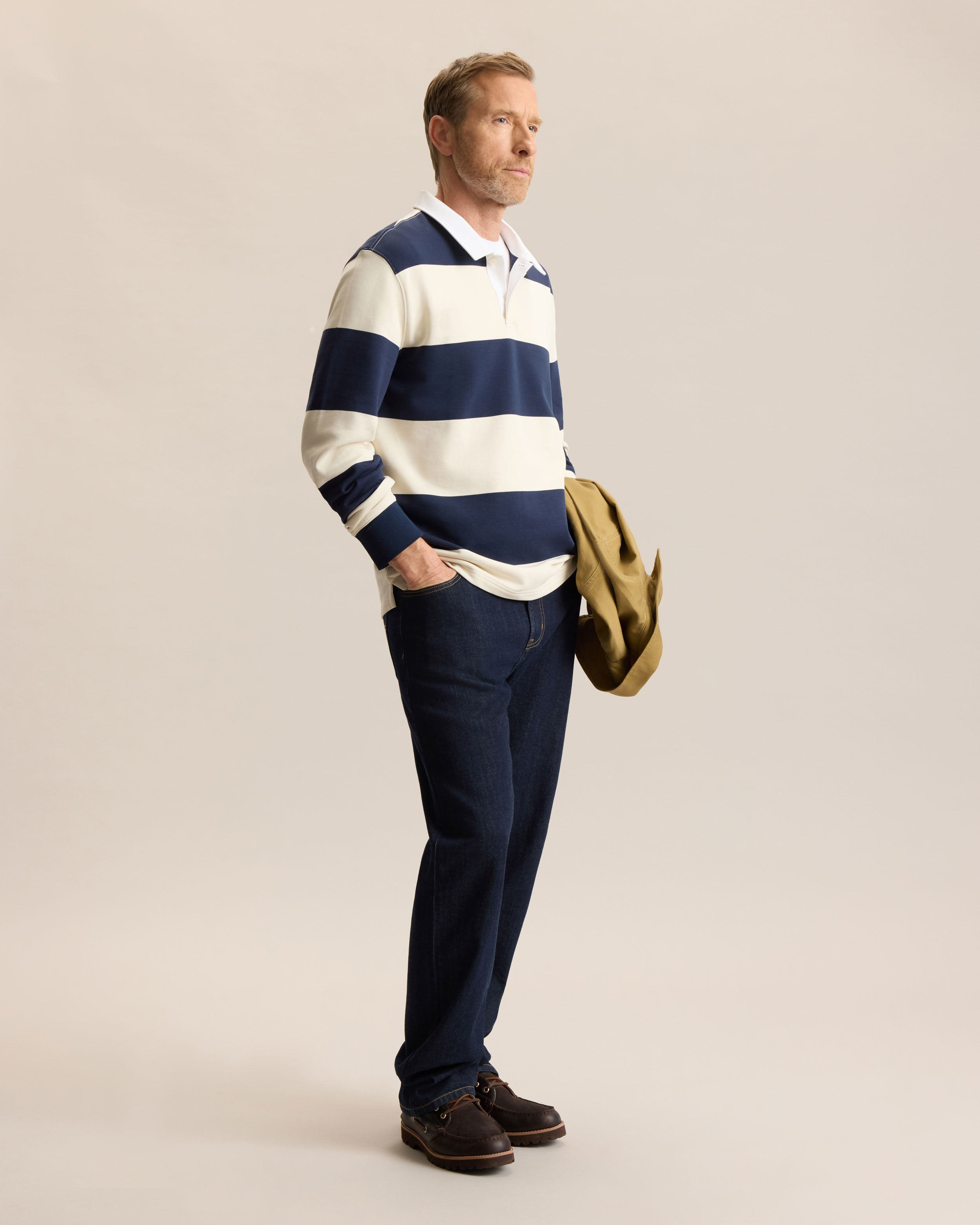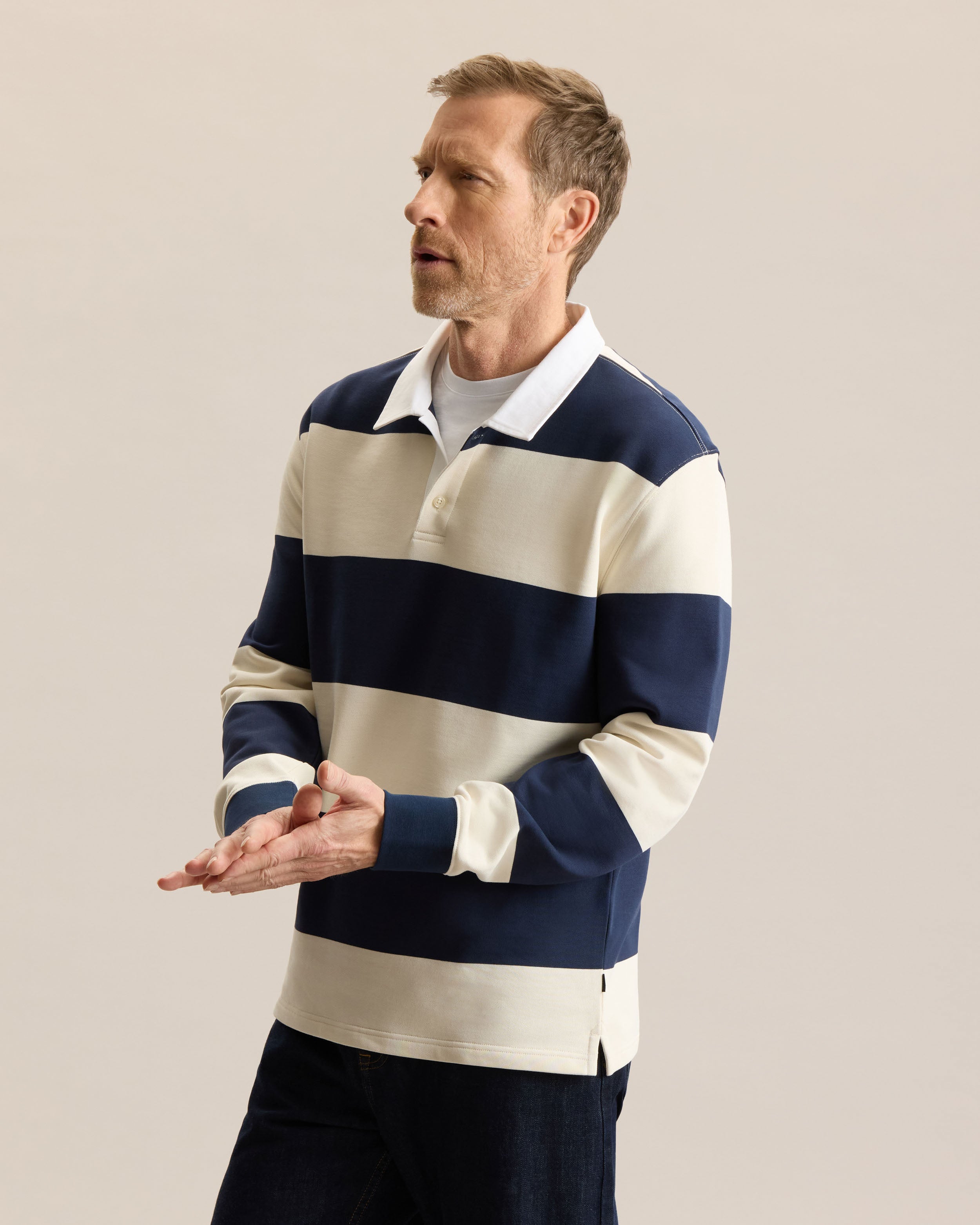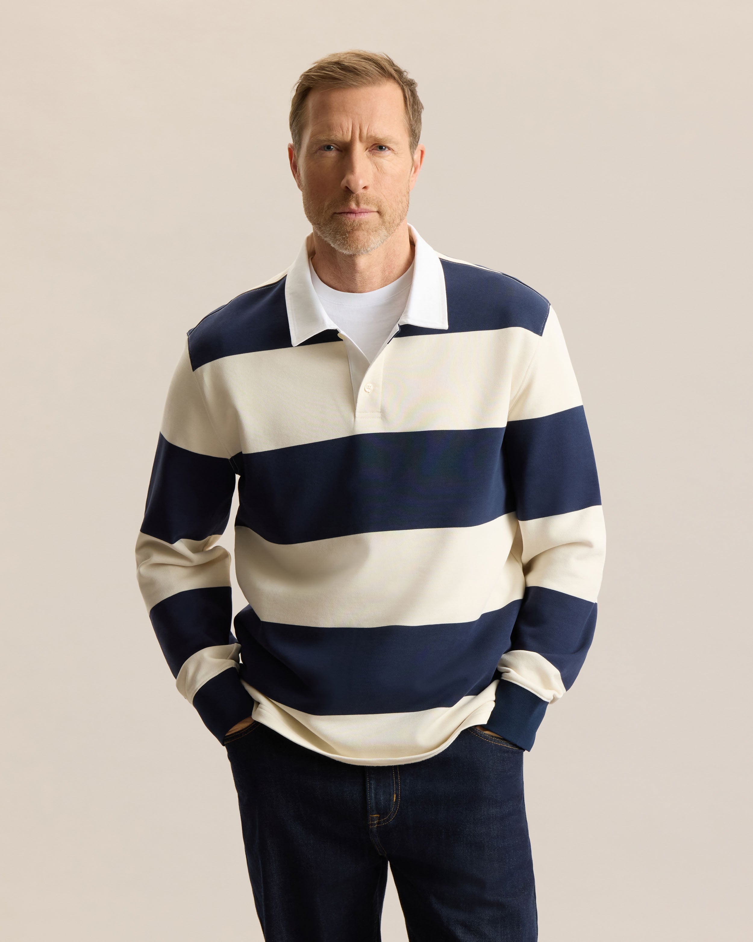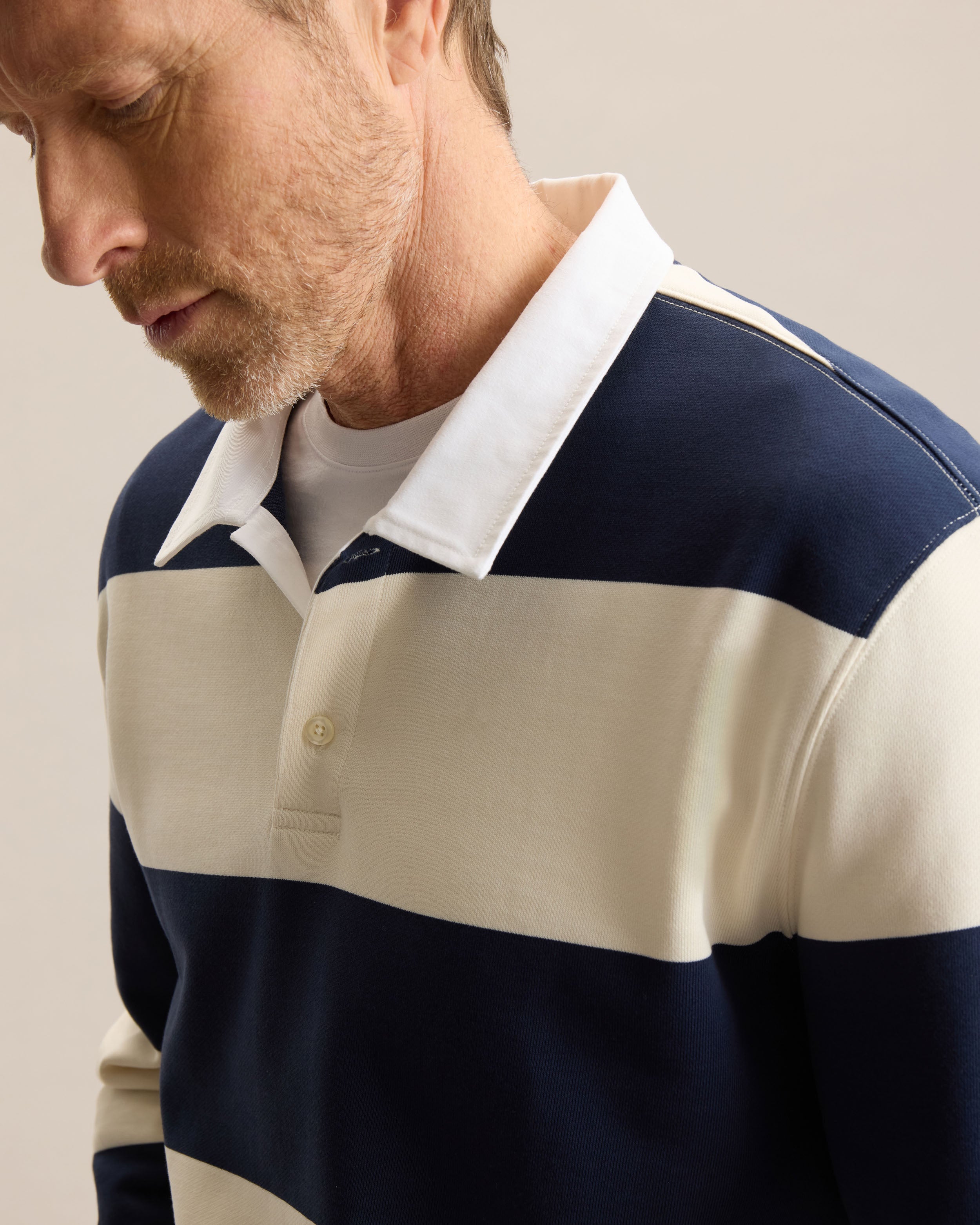 Inspired by the original rugby shirts worn in 19th century England, designed to stand up to rough play and unpredictable weather, this modern version keeps the spirits but updates the feel. Cut in a regular fit, it offers ease of movement while maintaining a structured look. Made from 380gsm French terry, it provides warmth while staying breathable. Finished with a woven twill collar and buttoned placket, it’s a versatile layer that you’ll reach for often.