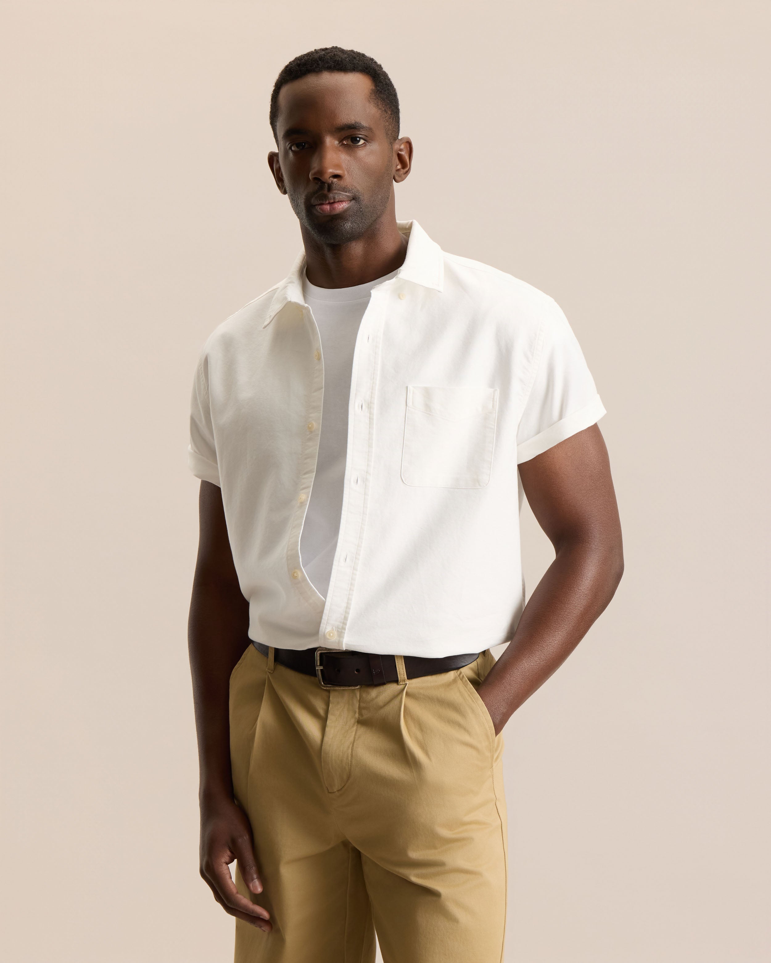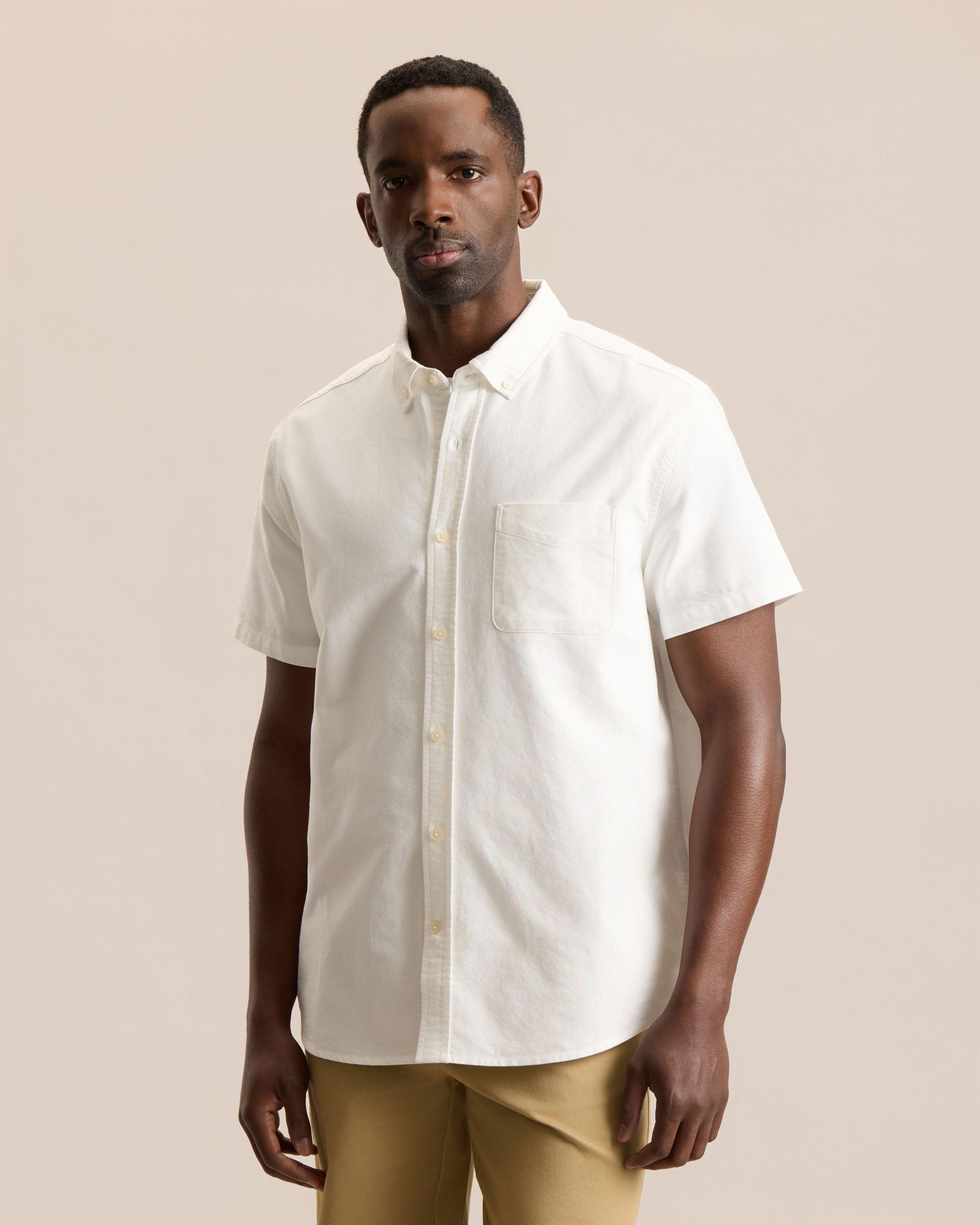 An iconic Frank and Oak essential, the Jasper Shirt is our short sleeve take on the classic cotton Oxford, a style that originated in 19th century Scotland where weavers created four fabrics named after universities (Oxford, Cambridge, Yale, Harvard), with the durable, breathable Oxford weave becoming the most popular.  It gained popularity with British polo players, who added buttons to their collars to prevent flapping during matches. Easy, breathable, and quietly confident, it's built to keep you comfortable while still looking put together. Designed in our Classic fit, it’s a timeless wardrobe staple we always carry and should always be in your rotation.