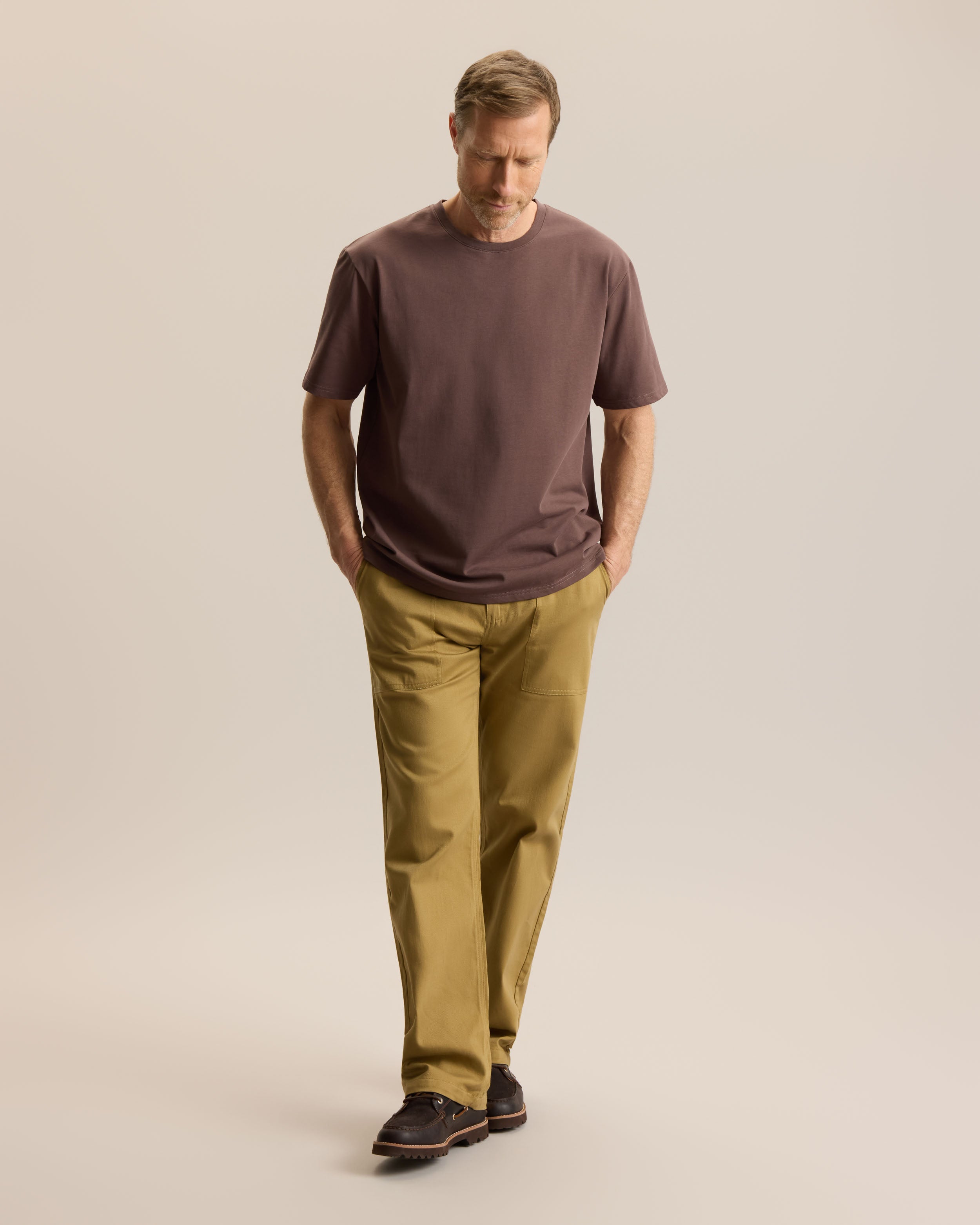 Easygoing and effortless, yet polished enough to wear out, this tee proves that relaxed doesn’t mean sloppy. Cut in a relaxed fit, it drapes naturally for a laid-back silhouette that feels good all day and holds its shape over time. Once considered strictly an undergarment, the T-shirt has evolved into a cultural staple, valued for cotton’s unmatched breathability, natural softness, and hypoallergenic comfort. We designed this one to be worn confidently on its own, crafted in a sturdier 220gsm weight that feels substantial without sacrificing ease. A stay-stitched neckline ensures the collar lies flat and keeps its shape, resisting curling or folding with wear.